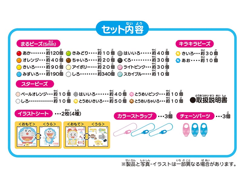 付属のチェーンパーツとカラーストラップで、ドラえもんやドラミのキーチェーンを作ることができます。