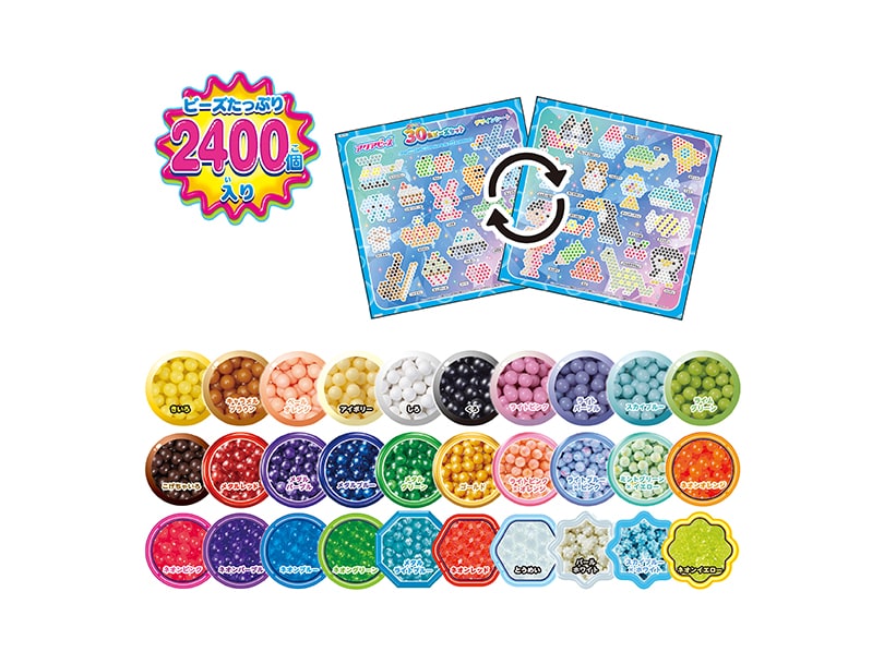 ●「ネオンカラービーズ」「パステルカラービーズ」「メタリックカラービーズ」「マーブルカラービーズ」が2400個・30種入ったセットです。