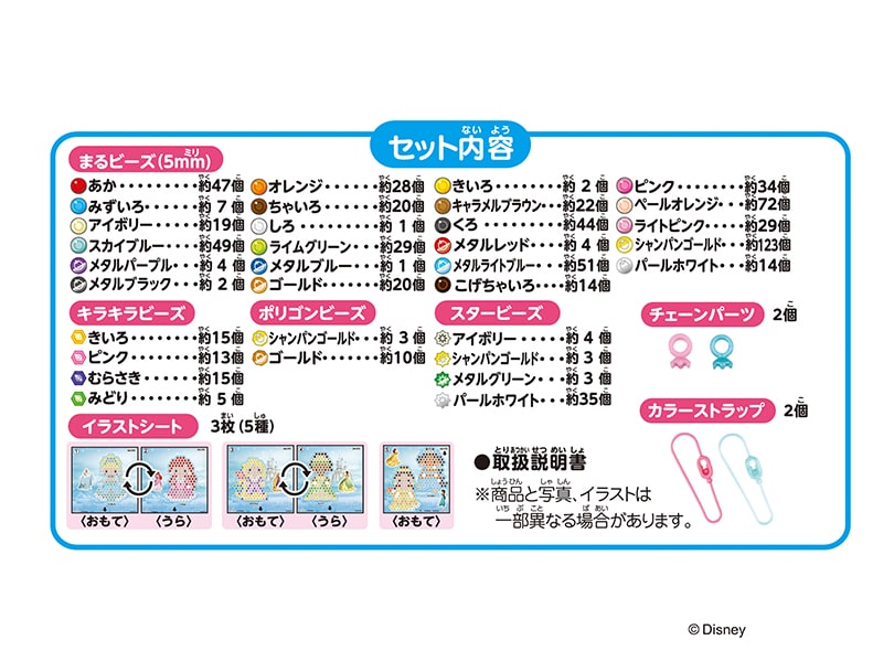 ●ディズニープリンセスの作品がつくれる、ビーズ・チェーンパーツ・カラーストラップ・イラストシートがセットになった商品です。