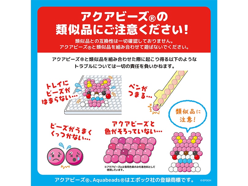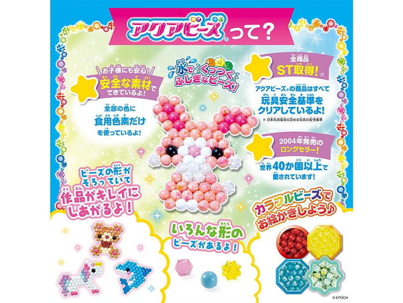 ※こちらの商品はビーズ・イラストシート・チェーンパーツ・カラーストラップがセットになった商品です。 別売りのアクアビーズ専用トレイと専用きりふき、またはそれらがセットになったアクアビーズ商品と一緒にお楽しみください。