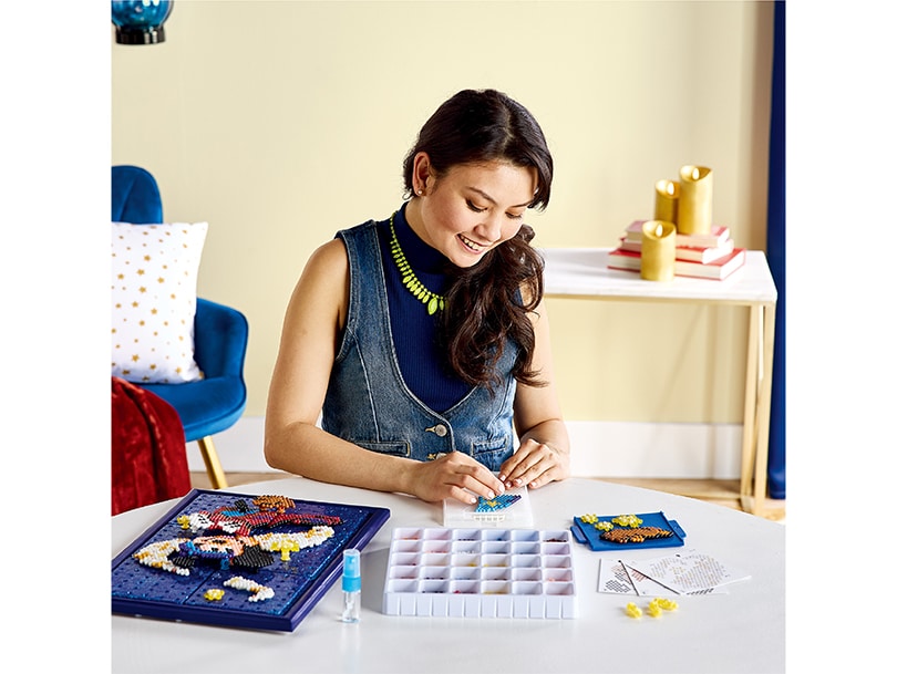 ●水でくっつく「アクアビーズ」で、立体的なモザイクアート作品がつくれます。